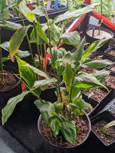 Though the cardamom has tripled in size, there are no signs of flowers. They are not near the height they can grow to so flowers could be a couple years off. Healthy looking. Not sure how to handle these over the winter. Let them go dormant or supplement light and see if they can maintain.