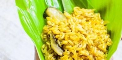 Sticky rice dumpling is more often seen wrapped in bamboo leaves, turmeric rice dumplings are very special and very regional. Instead of the flavors of the bamboo, it is floral and citrusy from the leaves of the turmeric and fresh ginger